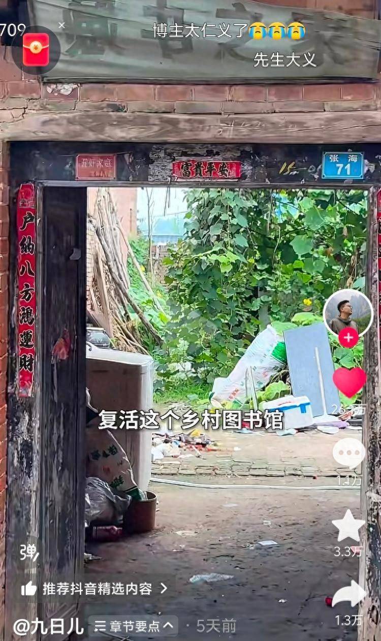 在山东菏泽定陶区一个普通村庄里,79岁的农民张传党用60多年时光,靠拾荒攒下两万余册图书,为乡邻筑起一座免费家庭图书馆。然而,岁月侵蚀下的图书馆日渐凋敝。今年10月,在自媒体博主田旭(抖音名“九日儿”)与村民近1个月的整理与装修下,这座一度沉寂的“乡村CBD”焕发新生,迎来久违的小读者。